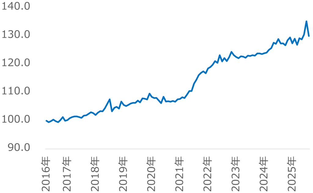 上のグラフは、2016年以降の建設工事費デフレーター(住宅総合)の推移です。グラフを見ると、建設工事費は徐々に上昇していることが分かります。特に2021年から2022年に急上昇しています。また、直近に公表された2025年8月は130.0で、2016年1月時点より30%上昇しています。この要因としては、原材料費の上昇をはじめ、人件費や運送費の高騰が建設工事費の上昇に繋がっていると捉えることができます。2021年に上昇幅が拡大した要因もウッドショックが大きく関わっていると考えられ、諸経費の増加は建設工事費に大きく影響を与える要素のひとつです。また、建設業界において「需要 > 供給」の構図ができていることも要因として挙げられます。これらの要因が重なったことで建設工事費デフレーターは着実に上昇が拡大しており、状況が大きく変わらない限り今後も上昇を続けていくと思われます。
